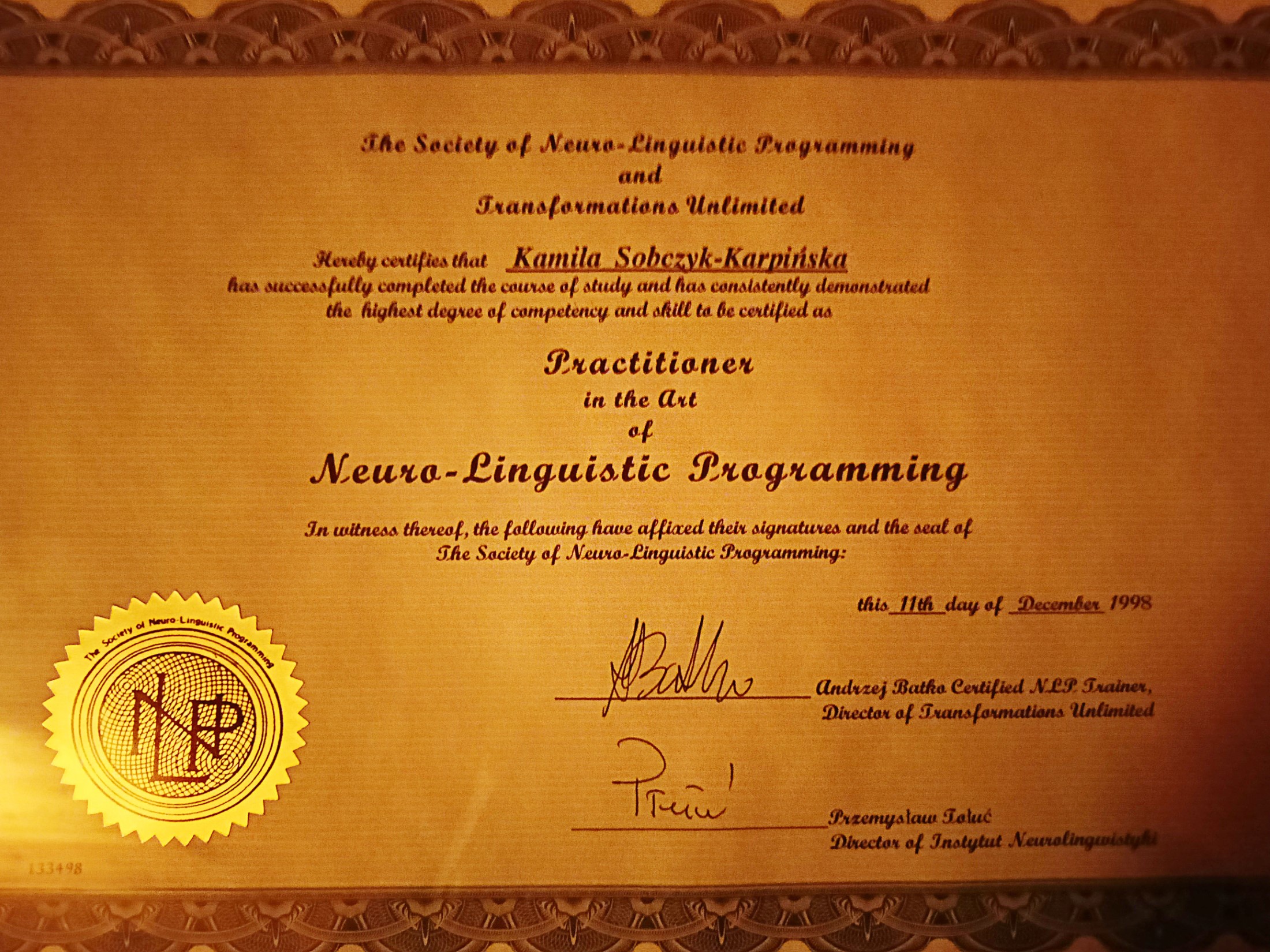 Wykorzystuję również wiedzę z zakresu Neuro-Lingwistycznego Programowania na poziomie Master.
