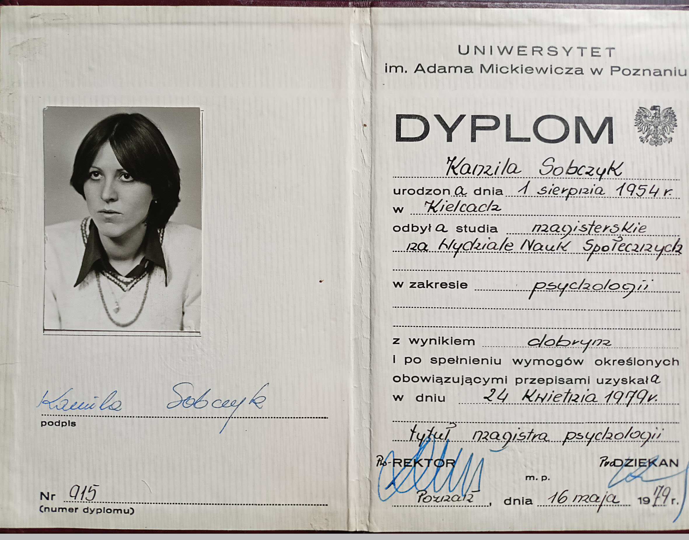 Dyplom ukończenia psychologii ze specjalnością kliniczną uzyskałam na Uniwersytecie Adama Mickiewicza w Poznaniu.
