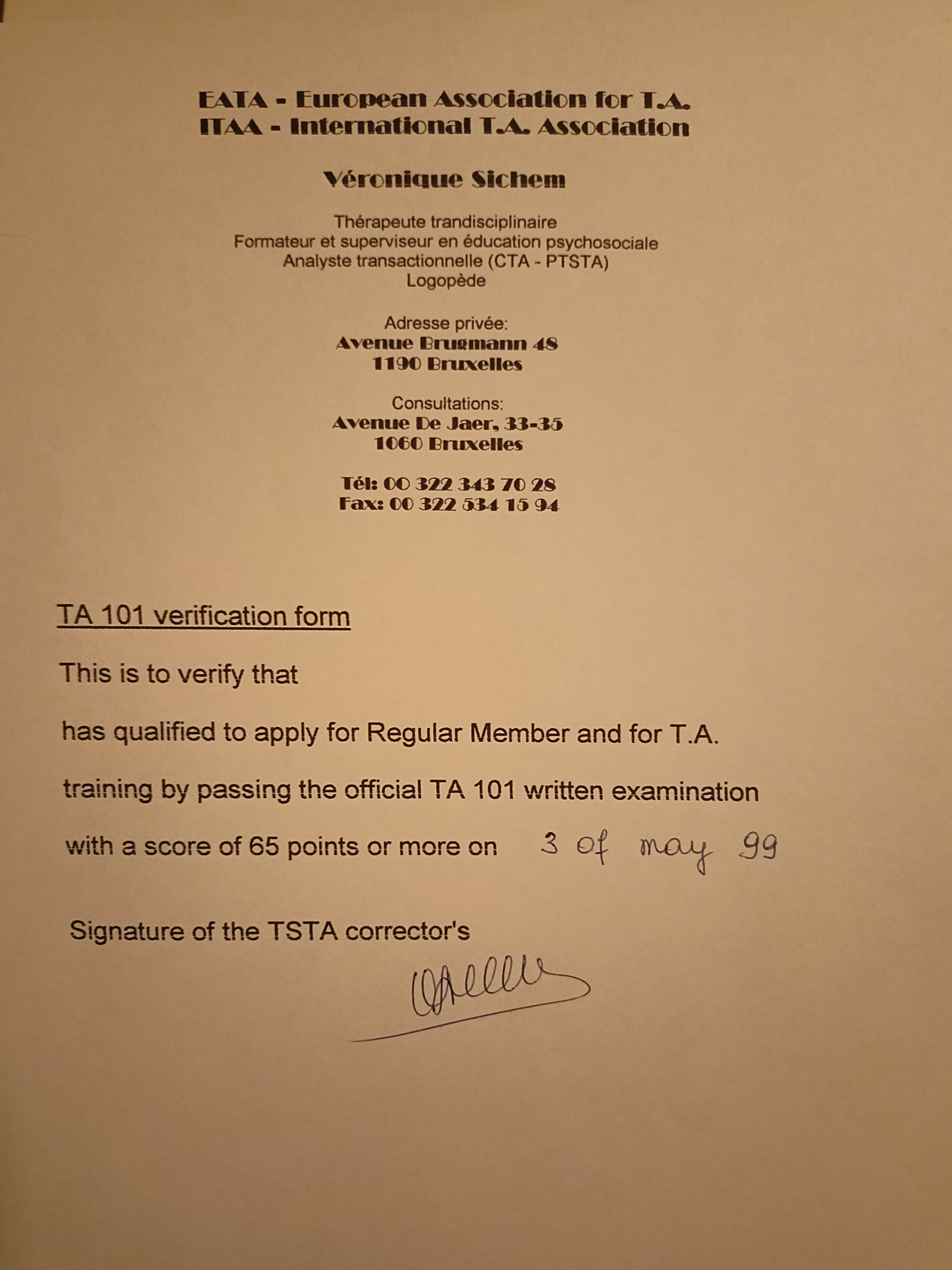 Terapię prowadzę głównie wg Szkoły Analizy Transakcyjnej, której drugi stopień ukończyłam złożeniem egzaminu przed Europejską Komisją ds. AT z siedzibą w Brukseli. Analiza Transakcyjna wskazuje metody poznania siebie i innych, pozwala wyjaśnić i zrozumieć mechanizmy powstawania konfliktów między ludźmi i podaje sposoby ich rozwiązania.